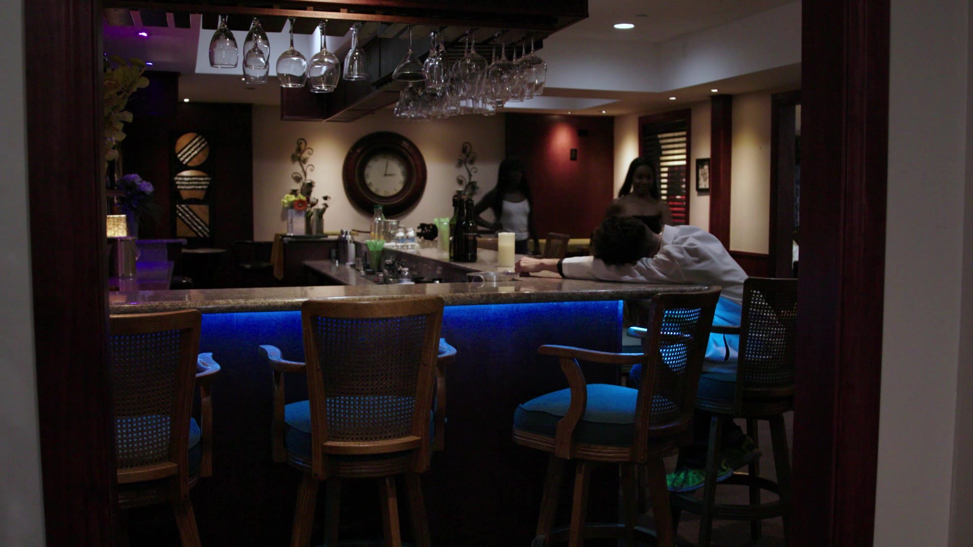 Scene 2 with Ana Foxxx (performing again) and Jenna Foxx was just average. While not bad, the scene as a whole was just not up to par with scene 1. The plot lead in was not that good. As bartenders, they were waiting on their last drunk customer. They wanted him to hurry up and leave so the two of them could get it on. Why all that buildup and suspense about it when they could have left this drunken (nearly asl--p) man for sex in the bathroom, just like they did, anytime? The periods of oral sex in the scene were short and there was too much movement (from chair to counter to floor) that broke up the sexual flow and continuity of the scene. Furthermore, whether in sex scenes or real life--I've just never been in favor of a bathroom as a sex location. To me, a john is just not a classy, artful, sensuous nor erotic place for sex.